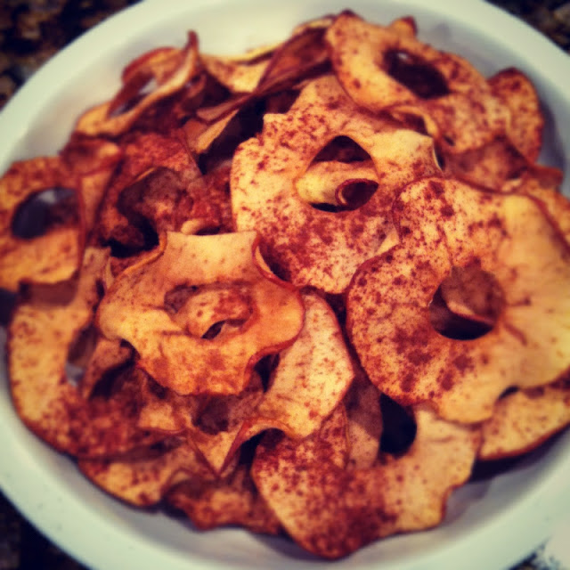 pretty huh? i love apple chips but can never bring myself to spend the money on those tiny bags....and i know the store bought ones are loaded with sugar. so i found this recipe on pintrest (we all love pintrest right?) and thought i would try them. i gave them a shot for the first time last week...and they turned out ok...but i didn't have an apple corer or anything to slice the apples thin with. but i thought what the heck? it can't be that hard to do it the "old fashioned" way. and it wasn't hard....but it took longer and i couldn't get the apples all sliced the same so some of them burned and some of them didn't get done enough. this time i went to wal mart and found me a corer and a slicer and tried again, and this time they came out great! just apples and cinnamon.....mmm crunchy goodness. they do take forever though because they have to bake on such a low temp.....but on the plus side they make the house smell delicious.